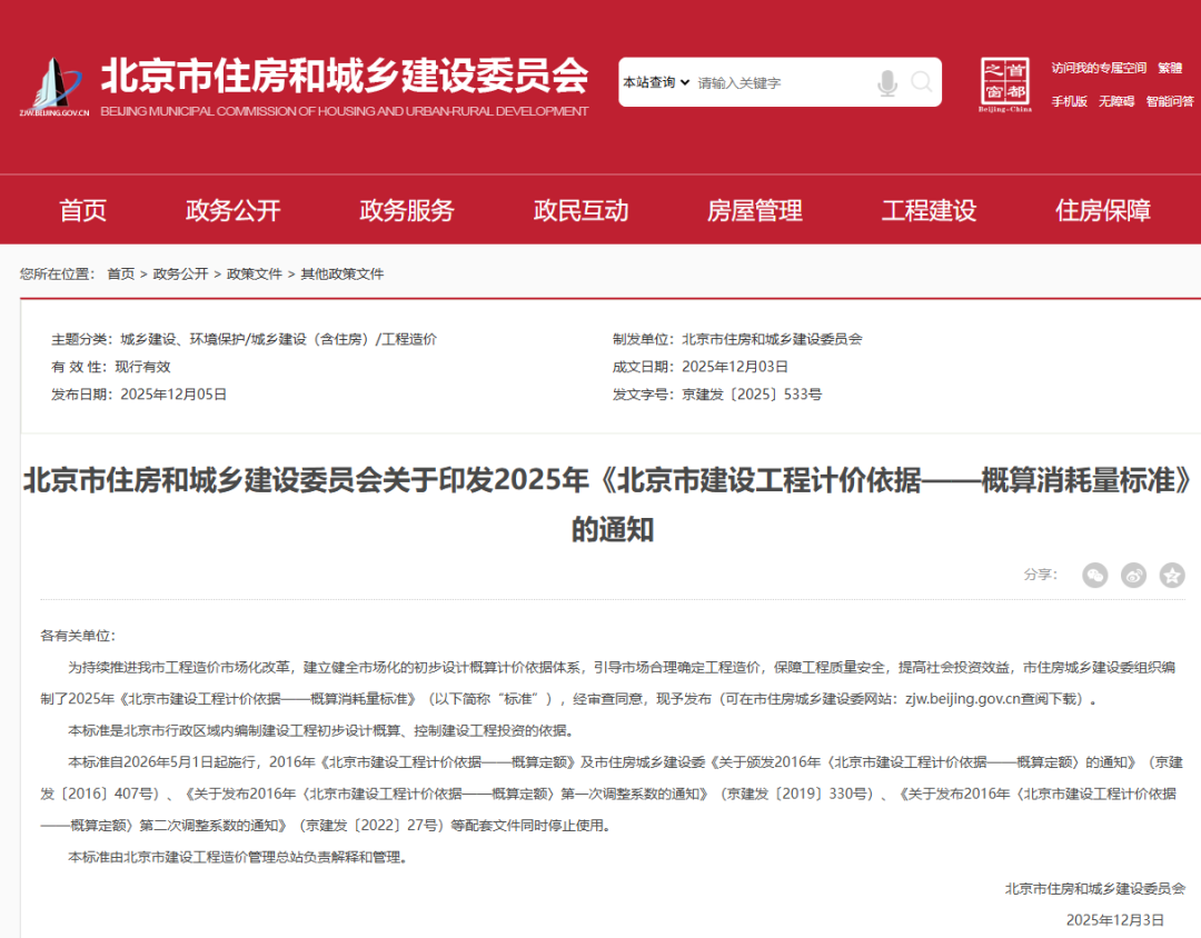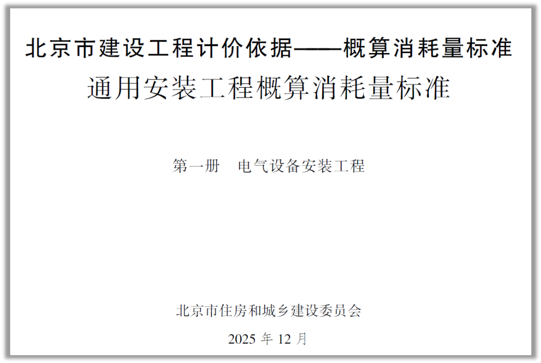 12月5日,北京市住房和城鄉(xiāng)建設(shè)委員會正式發(fā)布了2025年《北京市建設(shè)工程計價依據(jù)——概算消耗量標(biāo)準(zhǔn)》。本標(biāo)準(zhǔn)是北京市行政區(qū)域內(nèi)編制建設(shè)工程初步設(shè)計概算、控制建設(shè)工程投資的依據(jù),自2026年5月1日起施行。